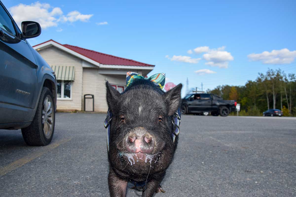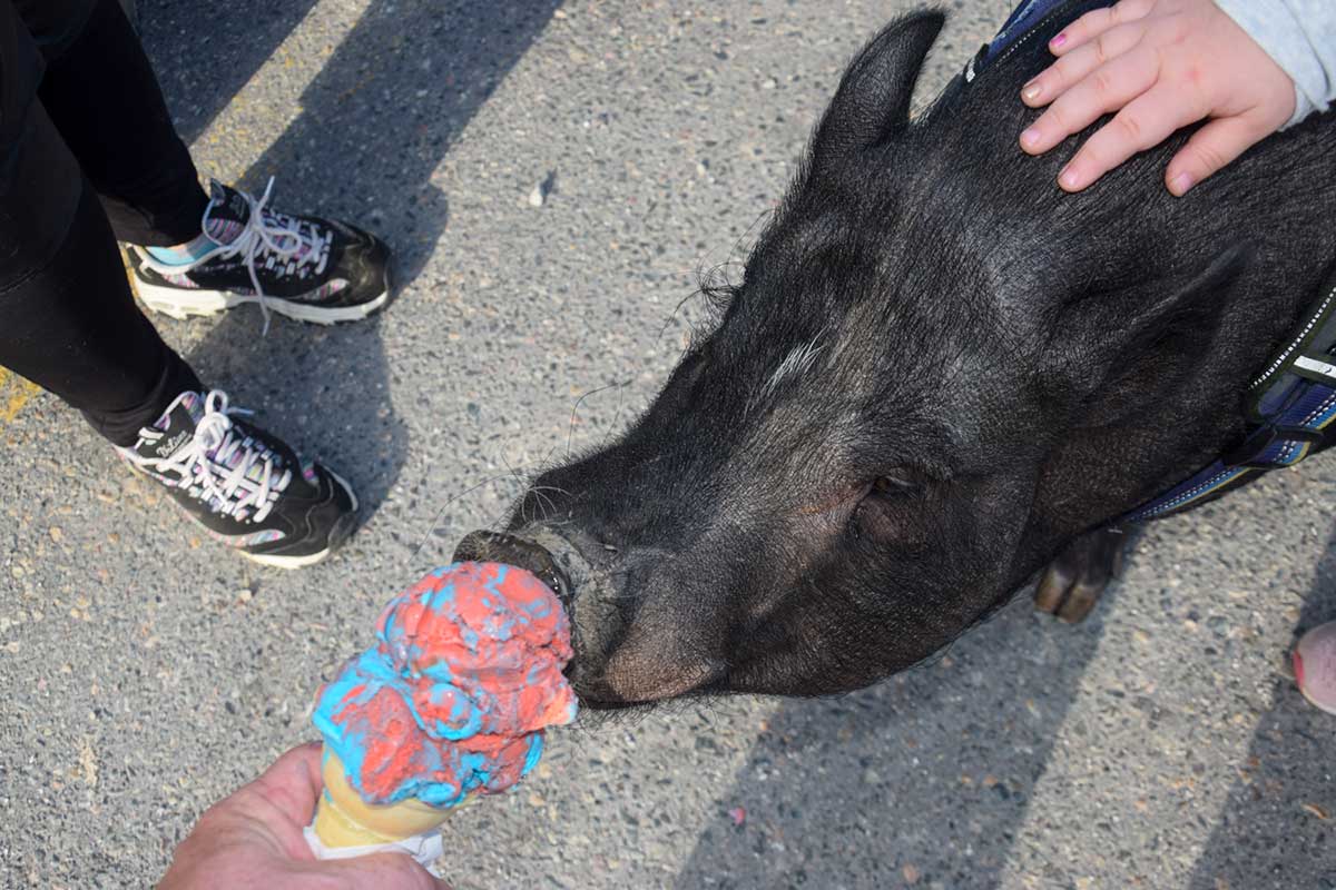 When The Expositor bought Walter a treat at Three Cows and a Cone in Little Current, it became clear he had discriminating tastes. He happily enjoyed a cone of Spider-man (spider-pig?) ice cream, as well as a chocolate cone that had fallen on the ground, but turned up his nose at a banana peel—a surprise for Ms. Bolden considering his love for freeze-dried banana chips.