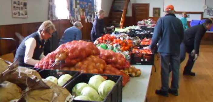 Volunteers with the Manitoulin Good Food Box Program haul supplies into the Little Current United Church Hall. The supplies will be divided up and packed into 111 separate bins ready for pickup or delivery to low income families in communities across Manitoulin.