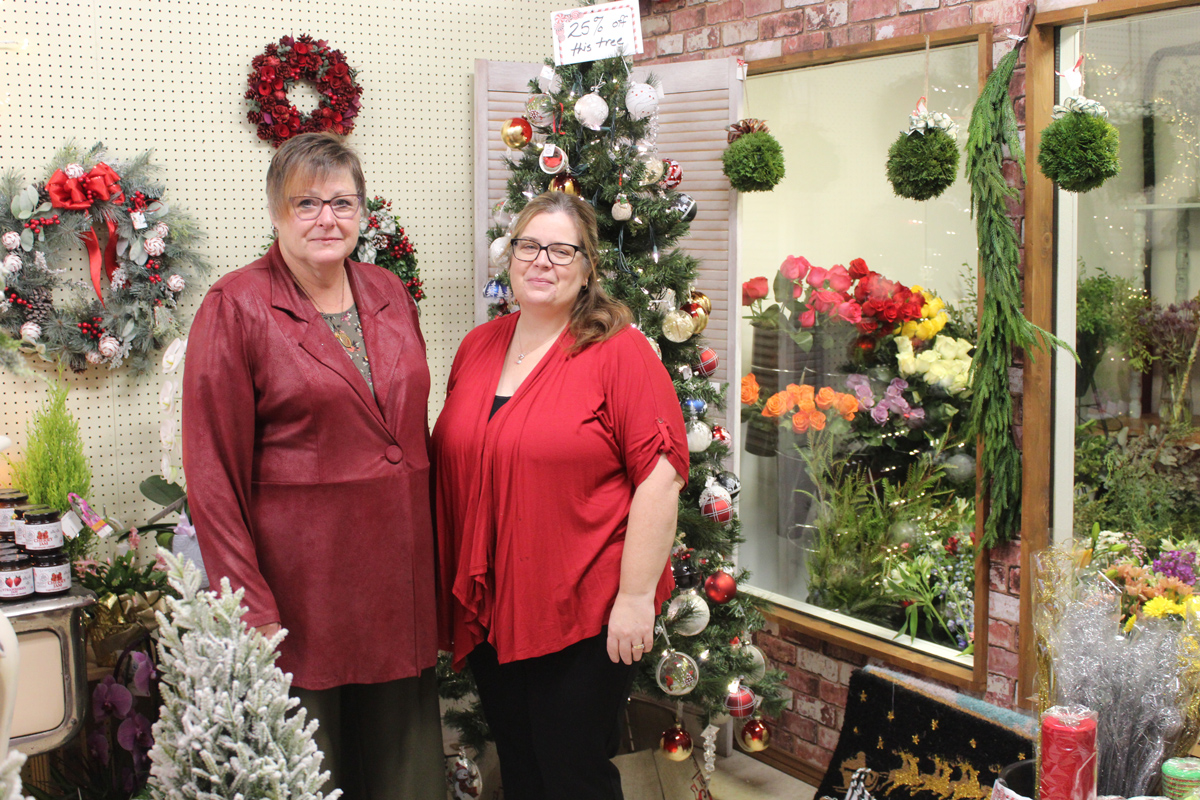 Janis Hutchinson and Jenn Quinlan of The Flower Hutch pause for a photo at a Christmas open house at the business in Gore Bay.