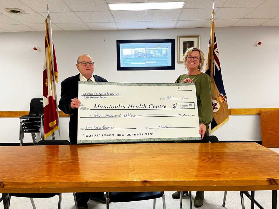 GORE BAY—Despite restrictions on usual fundraising activities, the Gore Bay branch of the Royal Canadian Legion was able to donate $1,000 to Manitoulin Health Centre (MHC)’s Let’s Emerg Together campaign. Legion Branch 514 President Jim Woods presented the donation to Paula Fields, president and CEO of MHC on October 18. He requested the funds be earmarked for the renovation and expansion of the Mindemoya Emergency Department. “The Royal Canadian Legion Branch 514 in Gore Bay, has continued to remain active behind the scenes, despite the restrictions of the pandemic,” Mr. Woods said. Branch 514 was able to raise funds through the sales of Nevada tickets. The branch also donated $1,000 to Health Sciences North in Sudbury. “I would like to take a moment to thank our membership for their continued support of the Royal Canadian Legion Branch 514,” he added. “Our community is so fortunate to have the level of health care facilities here on Manitoulin and it is so important we all contribute to its continued success.” When asked about the donation, Ms. Fields responded, “MHC is grateful to receive the continued support of the Let’s Emerg Together campaign. The renovation and expansion of the Mindemoya Emergency Department is ongoing, despite some supply chain issues. The donation on behalf of the Gore Bay Legion will help to ensure our community is better served. On behalf of myself and the board, thank you so much to the Gore Bay Legion and their members for considering MHC with this kind donation.” “It’s just something that needs to be supported,” Mr. Woods said. MHC is getting close to the end of their fundraising campaign for the emergency department but there’s still a need for new equipment, for example the chemotherapy unit, Ms. Fields said.
