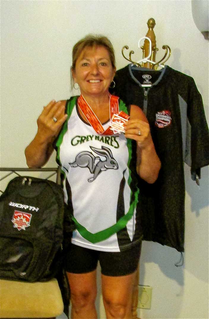 “The Grey Hares team has been together for four years now,” said Ms. Bray. “We compete in several tournaments and in order to go to the provincials we have to win at least one tournament in a year. In 2015 we went to the provincials in Niagara Falls and finished in first place, so we had the option of going to the nationals this year.” Ms. Bray said she started playing slo-pitch when she was about 26. “I can play anywhere in the field or catch; usually I play left field or catcher.”