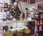 Across the hall is Whytes, owned by Ashley and Dylon Whyte, featuring the paintings and collages of iconic Gore Bay artist Jack Whyte and a selection of original paintings and collages, prints, postcards and ‘pocket art’ of his work. Also featured is the work of Anishinaabe artist Mark Seabrook, wooden walking sticks and flutes by local carver Will Smith, jewellery, chainmail and ‘bleachwear,’ a nod to the psychedelic era of tie-dyed clothing. Says Dylon: “We display a combination of fine and applied arts. This is our third year in the Harbour Centre; we came here after selling at farmers’ markets on the Island because we wanted to reach out to a broader audience. Here we can access a larger world audience through our Internet sites and projects. We enjoy the educational exchanges that happen here between artist and visitor. We’re proud to be here, this building is a jewel for the town.”