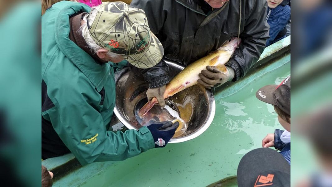 Mr. Strain first took all the students on a tour of the trap nets to show how they are operated. The walleye are removed from the weirs, brought to the tanks, milked of sperm and eggs and club members even help to mix the two together to fertilize the eggs. As part of his presentation, he pointed out that by protecting a spawning female walleye, a 10-pound fish will lay 300,000 eggs. Conversely, if 30 female walleye fish are harvested, it means nine million eggs are destroyed.