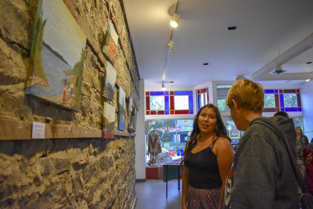 Ms. Ominika holds ‘A Water Walker’s Path,’ one of her favourite paintings in the exhibit, close to her heart as it reminds her of her late auntie Karen Manitowabi who started the annual water walk in her community of Wiikwemkoong. Ms. Ominika’s been on a few of the water walks herself and was moved and inspired by the scenery and looks forward to painting more pieces like this one.