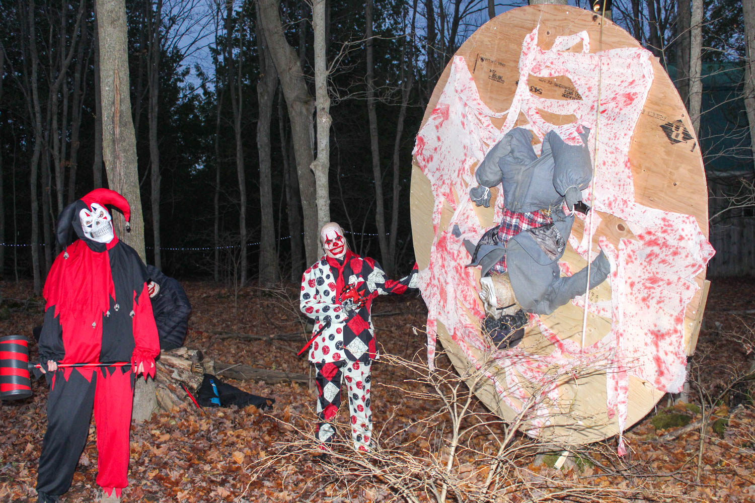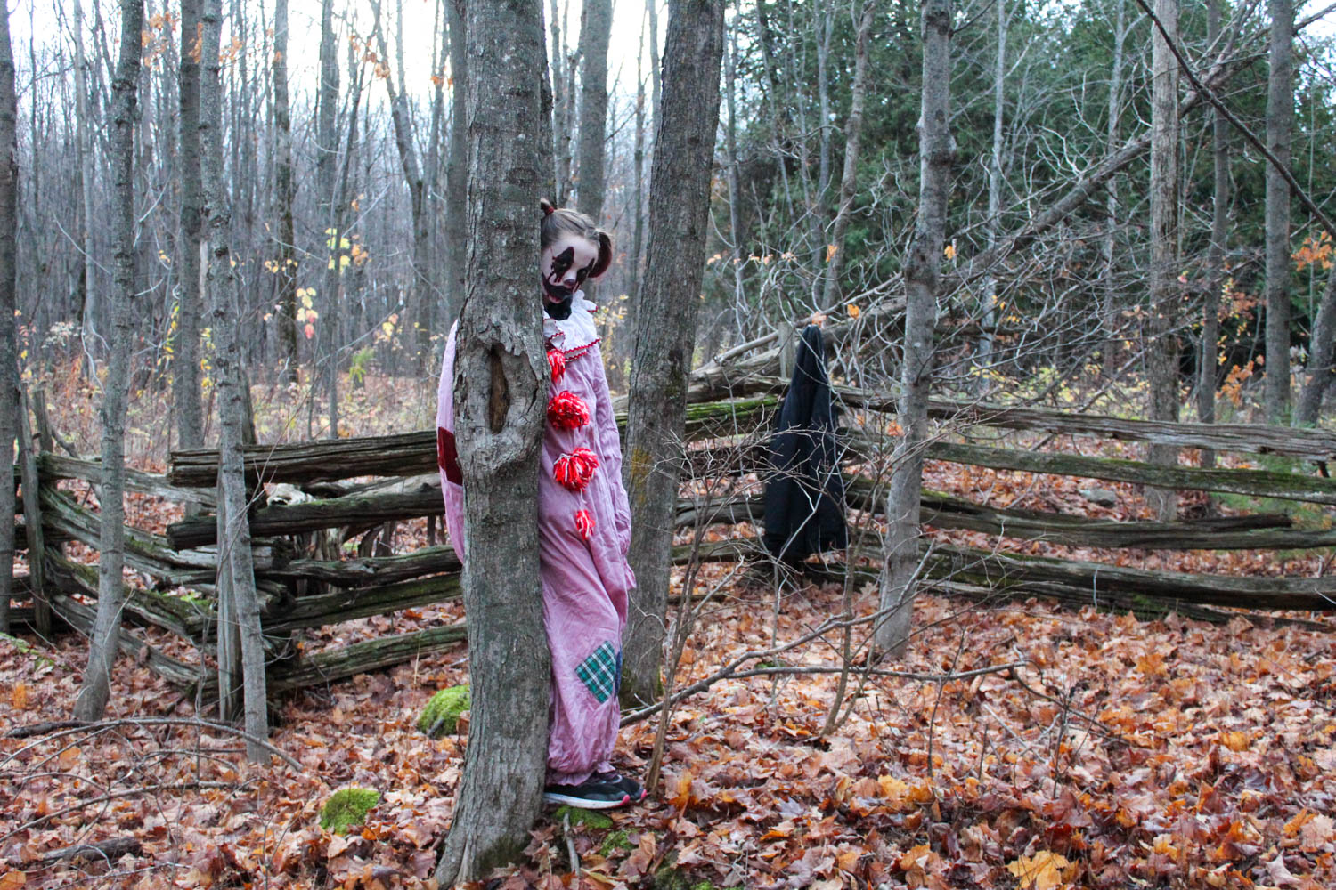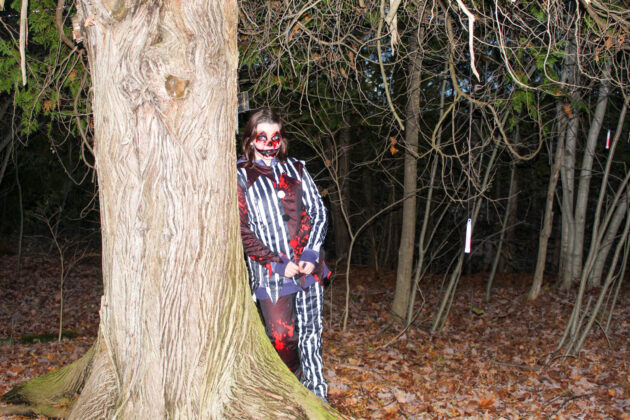 These two creepy clowns hiding behind trees are the real stuff of nightmares. Traveller beware at the Mindemoya Lions Club Haunted Trail.