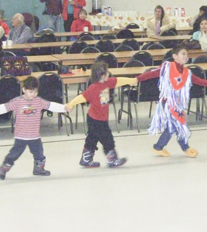 Guided by the dulcet voice of emcee (and drummer) Falcon Migwans and led by regalia-clad dancers including M’Chigeeng artist David Migwans, families joined in a variety of dances to bring in the New Year.