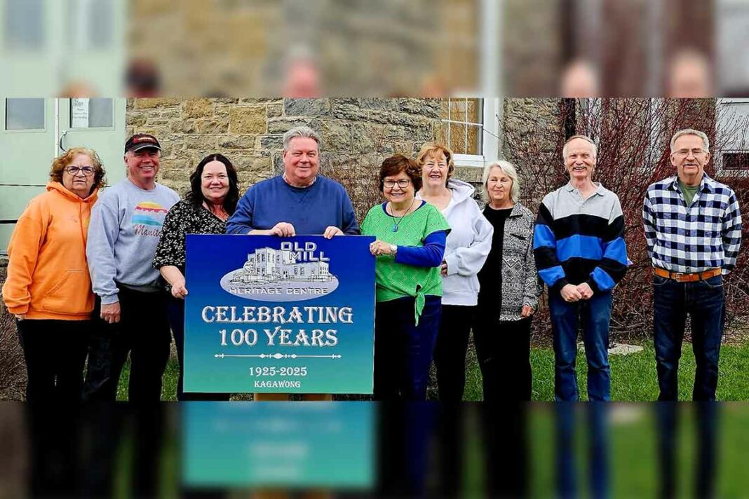 The Old Mill in Kagawong is celebrating its 100th anniversary this year, and heritage museum committee members and staff, including from left in photo, Diane Larocque, Brad MacKay, Harmony Hancock, Rick Nelson, Dianne Fraser, Deb Flaxman, Barb Edwards, Michael Hunt and Wes Newburn display the anniversary sign that will be displayed in the museum this year.