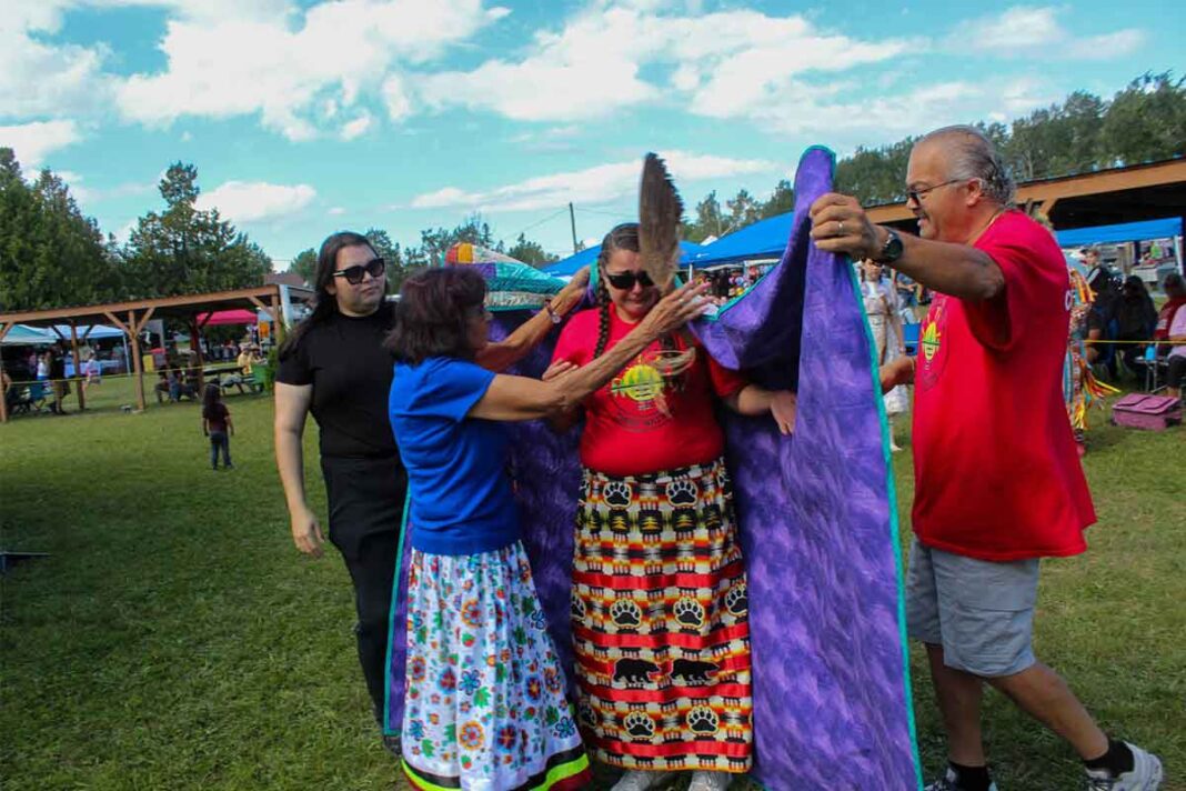 HONOUR BLANKET--An Honour Blanket was presented to Zhiibaahaasing band manager Bobbisue Kells-Riberdy, in recognition of her exemplary commitment to the community. In photo from left are Councillor Richard Mitchell, Chief Irene Kells, and Councillor Kevin Mossip wrapping Ms. Kells-Riberdy in her blanket.
