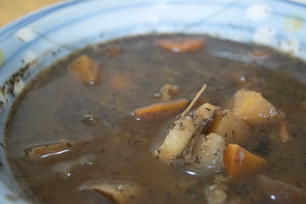 The stew and bannock finished at the same time and both looked equally tempting. The stew carried a deep, rich flavour that was well-balanced and satisfying, possibly aided by the use of a dark tea as a base.