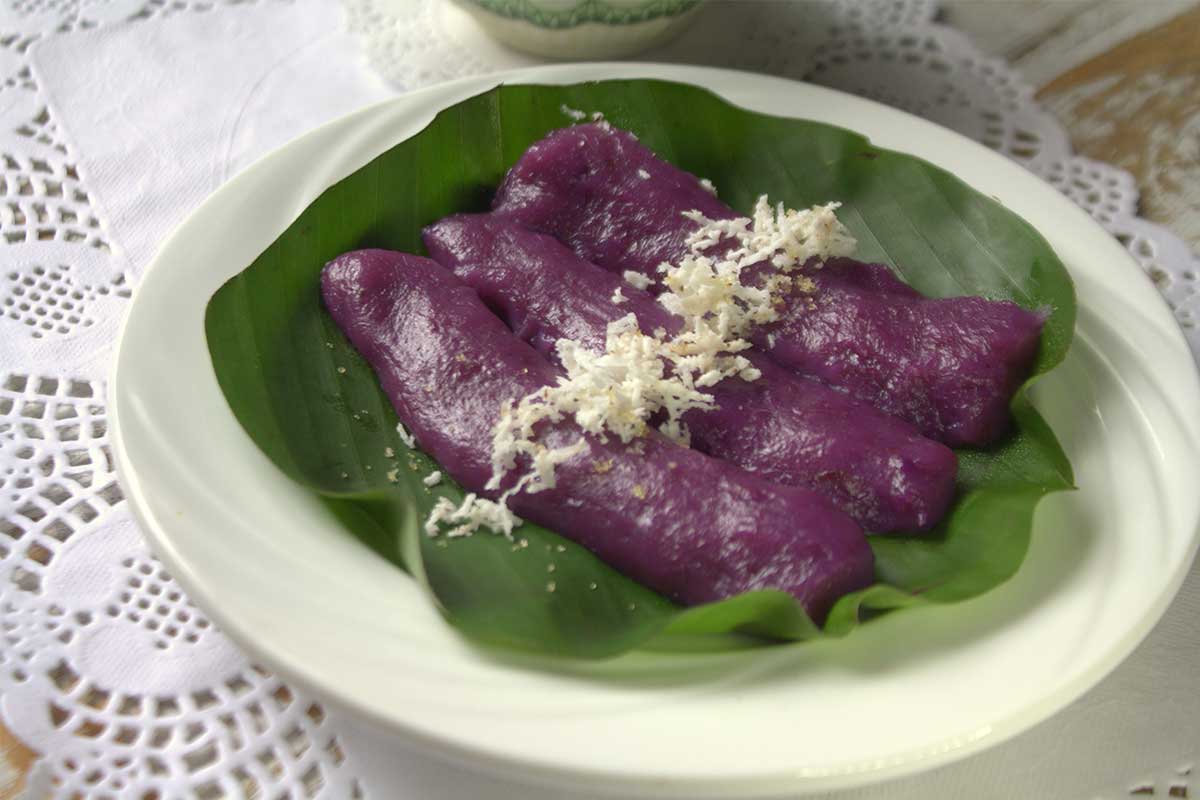 More traditional versions of this dessert are made with pirurutong (black rice), but the purple version has become the most common variety. This sweet treat features sticky rice cake that has been stuffed into bamboo tubes and steamed.