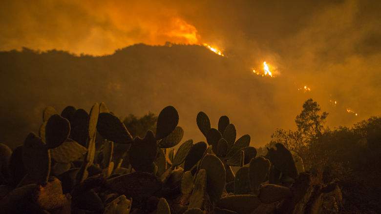 In the tinder dry region that is California, where crops are irrigated by quickly depleting aquifers far beneath the desert floor—forming patches of verdant green in an otherwise dissected dry brown vista—a flaming tumbleweed, hurtling through the countryside propelled by the relentless dry Santa Ana winds, makes short work of the barriers formed by the widest of roads. “And there are a lot of tumbleweeds.”