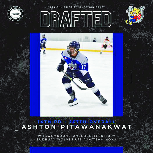 Another Manitoulin hockey player, Ashton Pitawanakwat, of Wiikwemkoong Unceded Territory was selected 267th overall (14th round) by the Barrie Colts in the OHL draft this weekend.