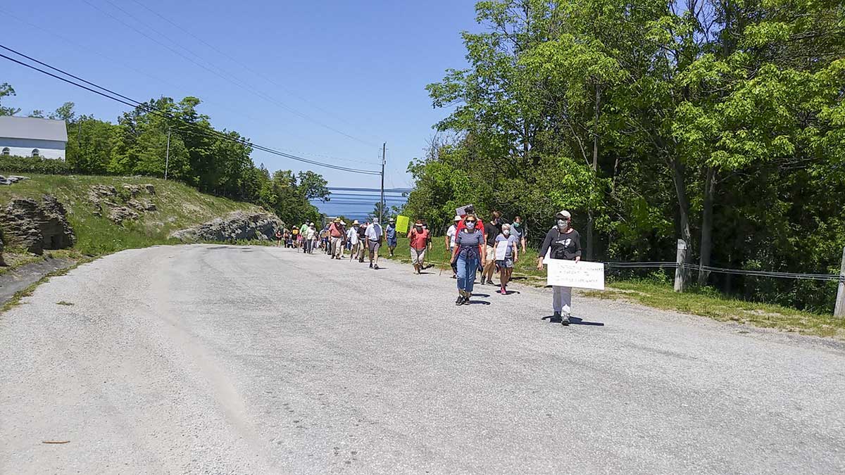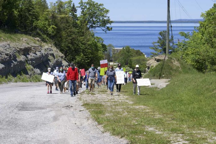 KAGAWONG – A shared passion for social justice and the eruption of emotion following the death of George Floyd in Minneapolis led Reverend Janice Frame and Sandy Cook to organize a peaceful walk in solidarity. The Sunday, June 14 walk drew at least 50 supporters to the Aus Hunt Marina in Kagawong, where the walk began. People carried signs containing positive messages and used noisemakers to enthusiastically show their support. COVID-19 guidelines of physical distancing and wearing face masks were followed.