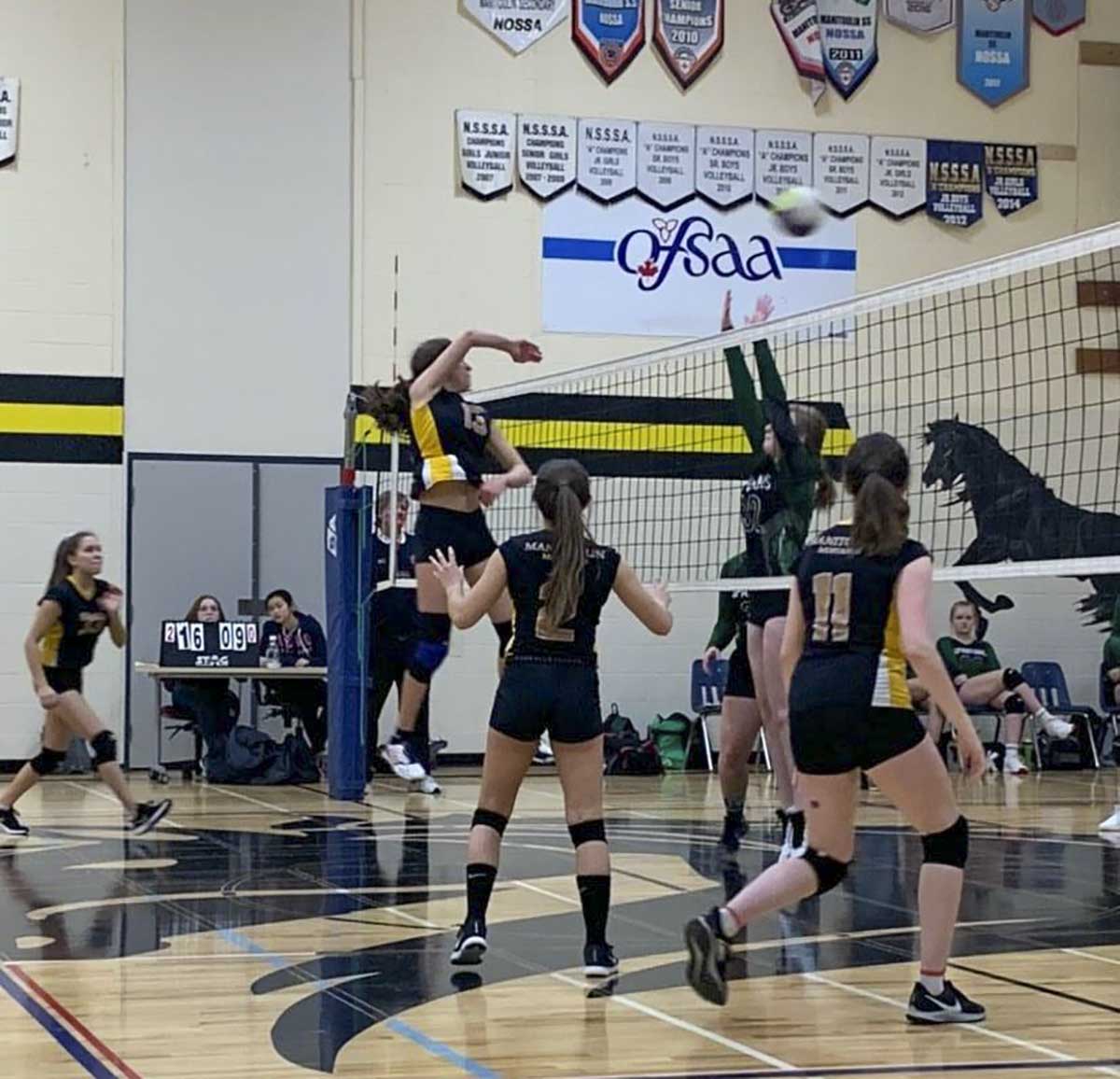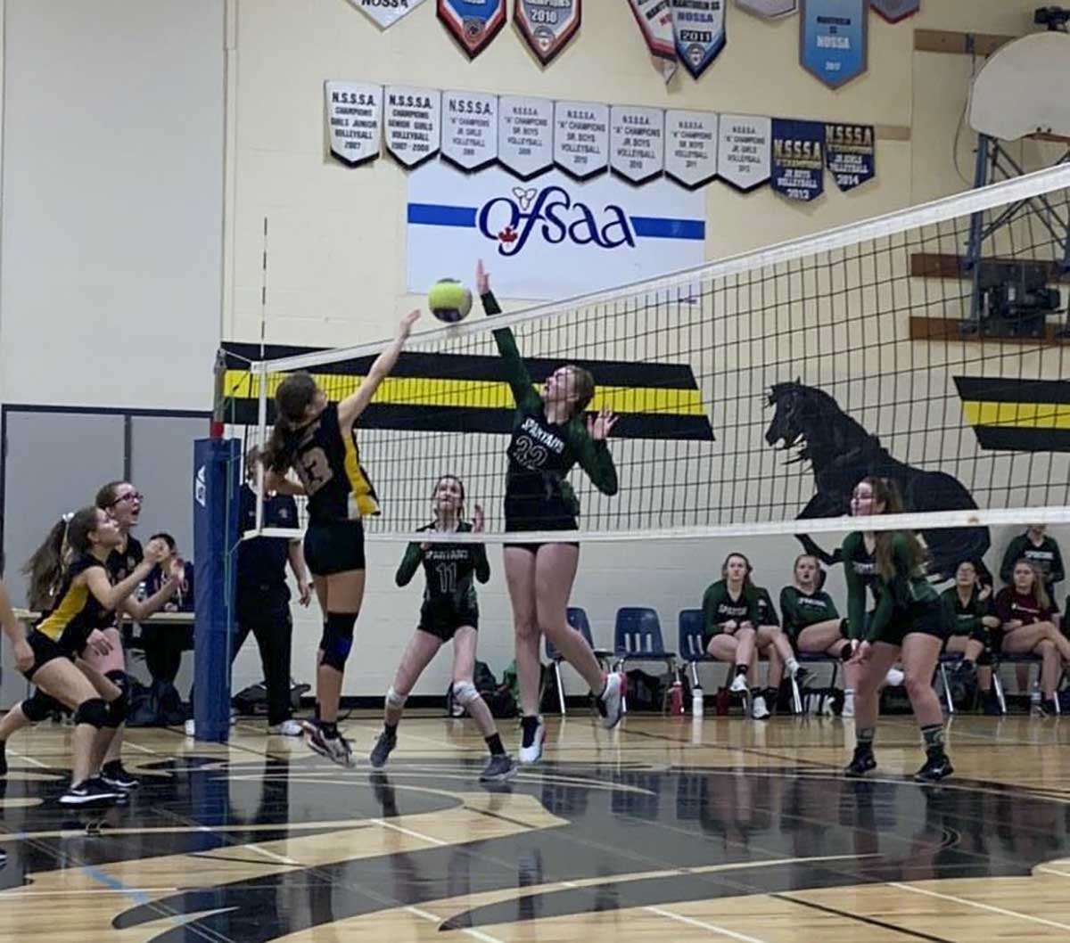 BILLINGS – The Manitoulin Secondary School (MSS) Mustangs junior girls’ volleyball team has just concluded an undefeated season with a victory over Espanola to take the North Shore Secondary Schools Association (NSSSA) title at a showdown held at MSS last Wednesday, February 12, earning the girls a spot at the upcoming Northern Ontario Secondary School Athletics (NOSSA) championships in North Bay.