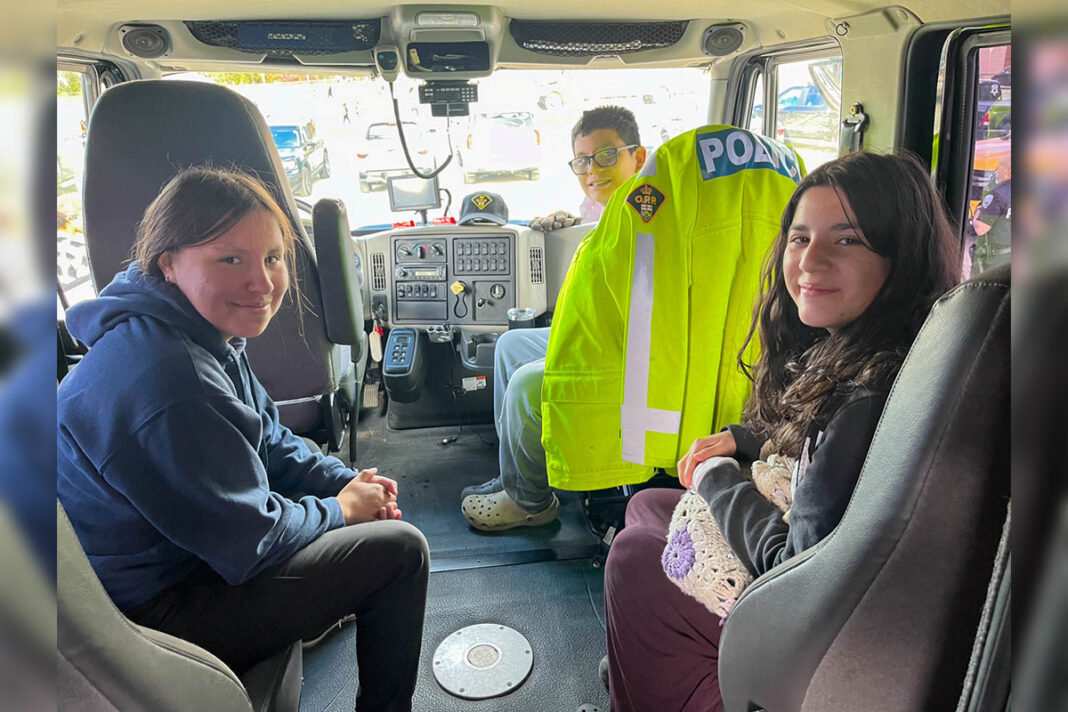 Wiikwemkoong Junior School Grade 8 students Olive Bomberry, Trenton Trudeau, Mylah Trudeau tour an Ontario Provincial Police mobile command unit that was stationed at the Wiikwemkoong arena as part of the Wikwemikong Tribal Police Services Community Safety Fair held on Wednesday of last week. This was just one of the safety-related displays on hand for the public to explore. See story.