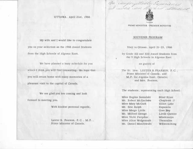 The prime minister’s message read, “My wife and I would like to congratulate you on your election as the 1966 Award students from the high schools of Algoma East. We have planned a busy schedule for you which I think you will find interesting. We hope that you will return home with many memories of a pleasant visit to the capital of Canada. We are glad you are coming and look forward to meeting you.” It was signed “With kindest personal regards, Lester B. Pearson, P.C., M.P., Prime Minister of Canada.”