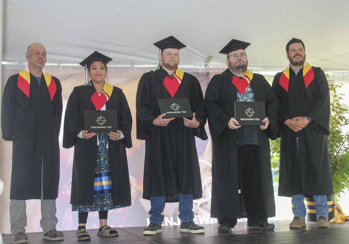Canadian Welding Bureau Certification graduates were all smiles as they accepted their certifications. From left, Kenjgewin Teg welding instructor Dave Barnes, graduates Brittnee Waindubence, Declan Allison and Christopher Spong, and Skills, Trades and Apprenticeships Program Coordinator Jade Peltier. photo by Veronica Roy