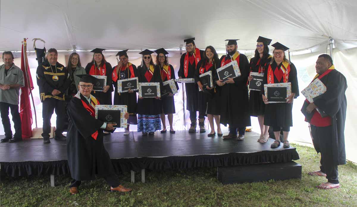 Twelve graduates this year graduated with Anishinaabe Aadziwin Distinction. Throughout the academic year, students in all programs track and document their voluntary participation individually or as a class in their chosen Aadziwin activities, with a goal of reaching a minimum of 24 hours by the end of the academic year. With the minimum hours achieved, graduating students are recognized on this day as an Anishinaabe Aadziwin Distinction Graduate. photo by Veronica Roy