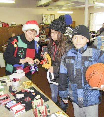 MINDEMOYA—The Children Shop for Free event, held December 14 at the United Church in Mindemoya, was another great success as children and their parents were lined up at the door and outside for this popular Christmas occasion. Three elves, Eva Bond, Willie Monroe and Marion Seabrook, were seated at the entrance to the magical room to greet the shoppers, ask about the presents to be picked out and to hand out tickets for free shopping. Other elves helped out on the floor and behind the counters of the large number of items for the kids to pick out for their sisters and brothers, mommies and aunties. Meanwhile, even more elves were seated at the back of the room, ready to wrap all the presents and others were in the kitchen serving coffee, tea and cookies to the parents.