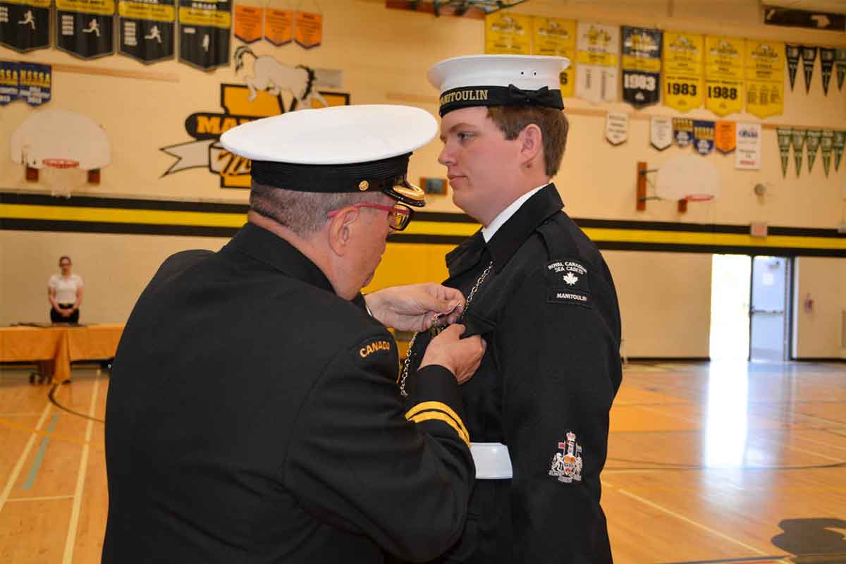 KING CHARLES III CORONATION MEDAL—CPO1 Landon Aelick, right, was surprised during the annual 348 Manitoulin Royal Canadian Sea Cadets Review on Saturday to receive a King Charles III Coronation Medal for his efforts as a cadet over the years, most recently as coxswain. Lt.(N) Sylvain Boucher, past commanding officer of 348 Manitoulin, presented CPO1 Aelick with the prestigious honour.