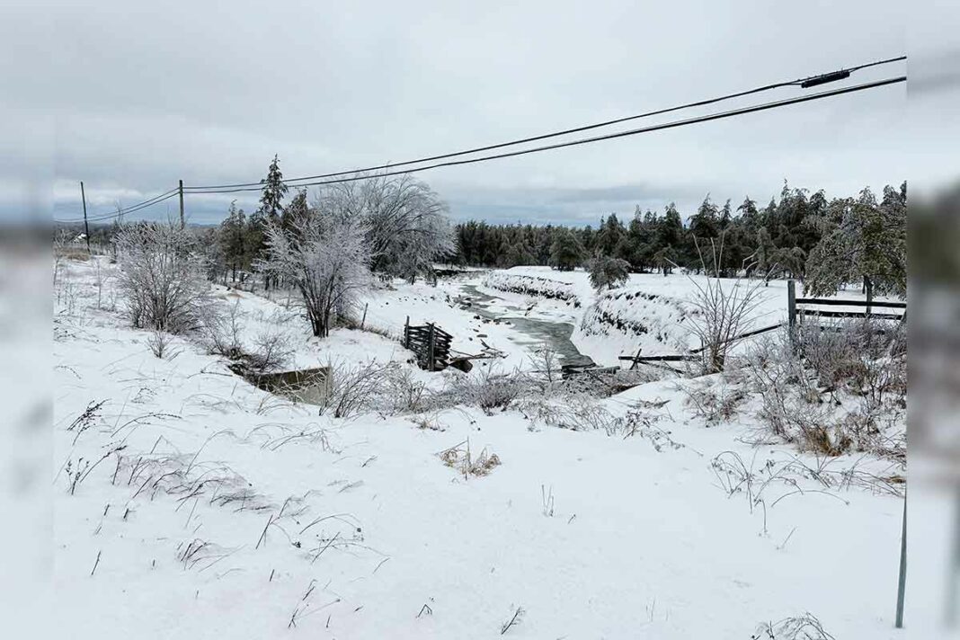 The past weekend’s freezing rain left all of Manitoulin weaving a crystal coat, rendering the landscape seasonally scenic, at least for a little while. This little brook, off Highway 6 and north of the village of Sheguiandah, continued to babble through its icy surroundings.