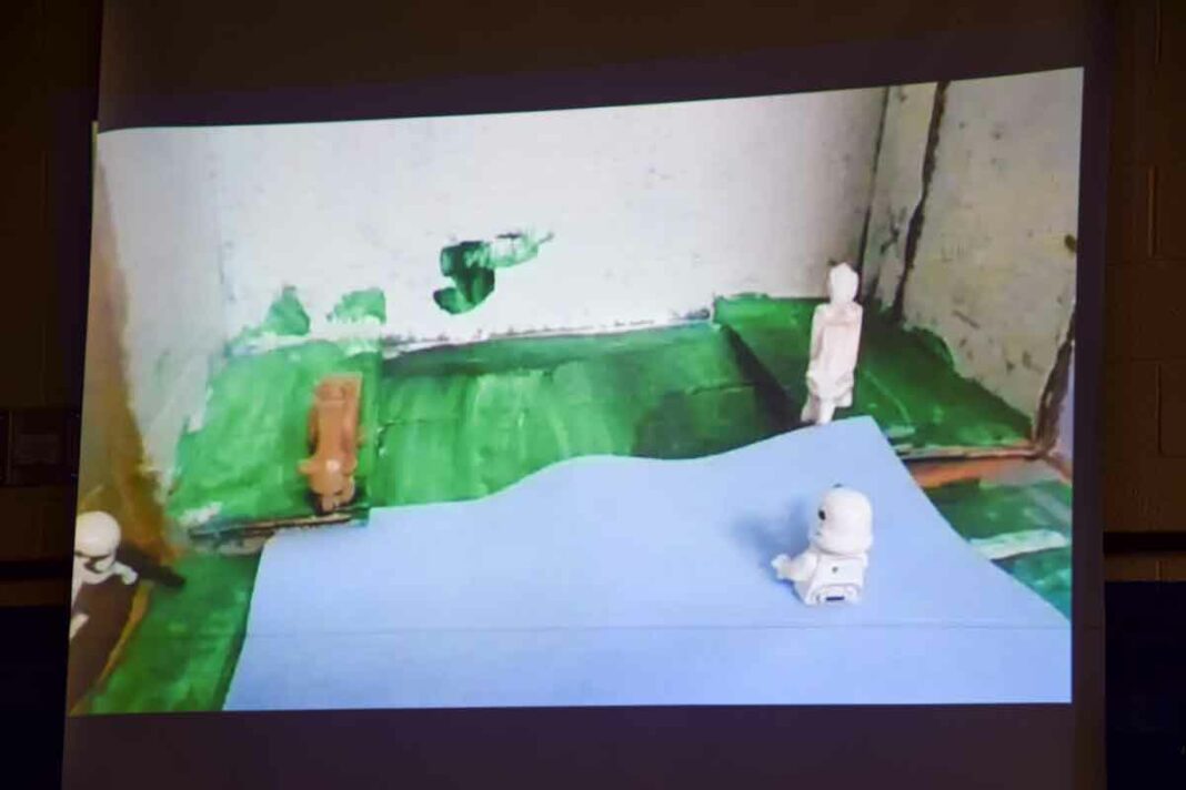 Hard work might be a bit of an understatement. The students utilized a process called claymation, a form of stop-motion animation where each animated piece, including characters and some backgrounds, are usually constructed out of a malleable substance, typically plasticine clay. Each frame is then recorded on video, edited and then played back in rapid succession, giving the illusion of movement.