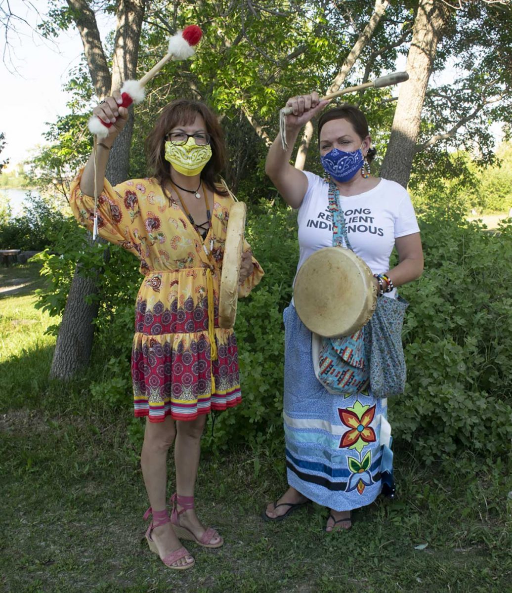Valerie Beaudin, left, and Kimberly Debassige offered a drum song that was a tribute to the 1969-1971 Indigenous occupation of Alcatraz.