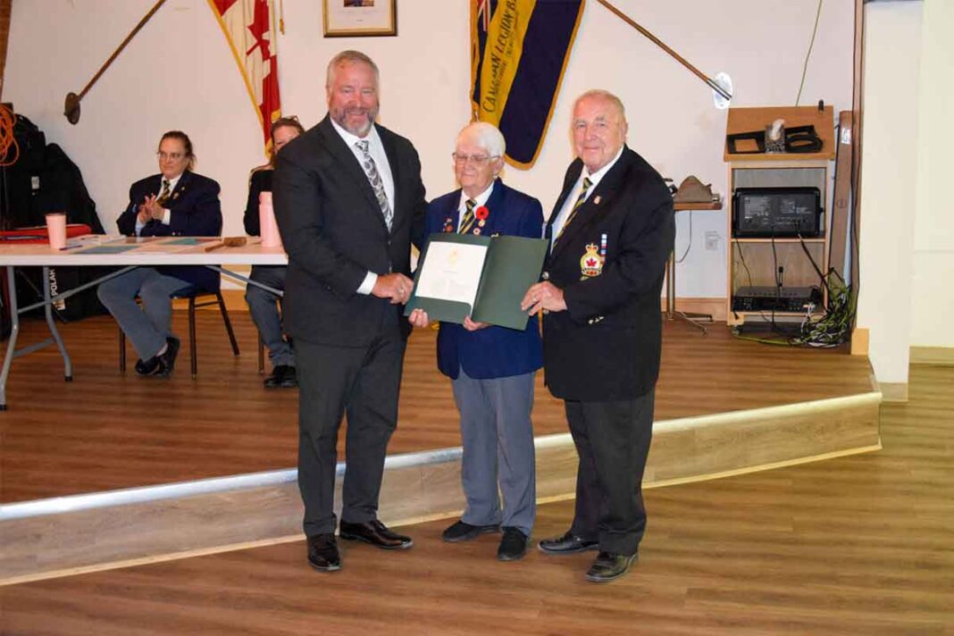Mr. Mantha then called Legion Public Relations Officer Comrade Roy Eaton to the front of the assemblage. “I wanted Roy to come up with me and help me out with this, he said.”