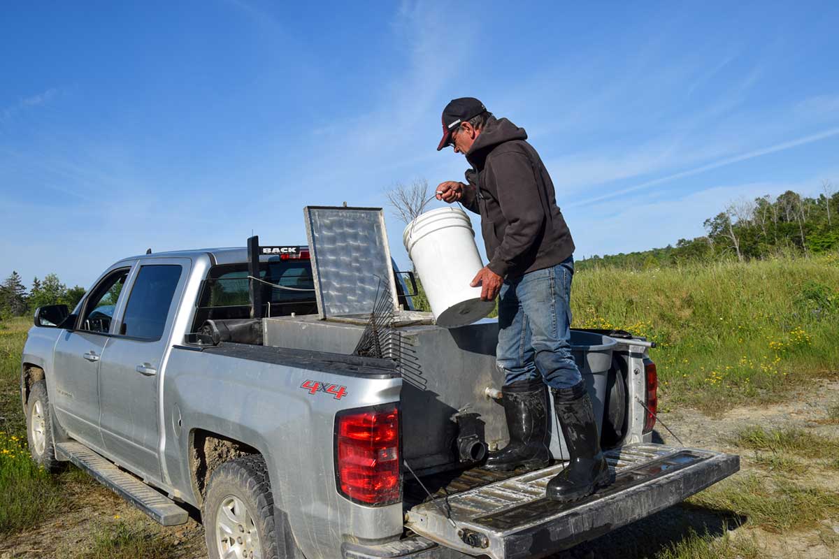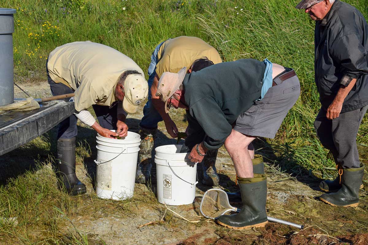 When the net arrived close to the shore, the volunteers hunched over its length to capture the fry and move them into large white pails that were then dumped into the holding tank on the back of a pickup.