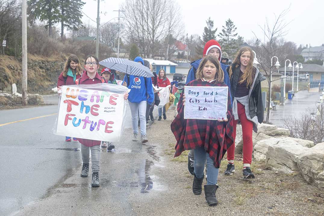 LITTLE CURRENT – Under dark skies and relentless rainfall this past Friday, dozens of Little Current Public School (LCPS) students stepped outside with signs and chants ready to protest the Ford government’s cuts to the Ontario education system.