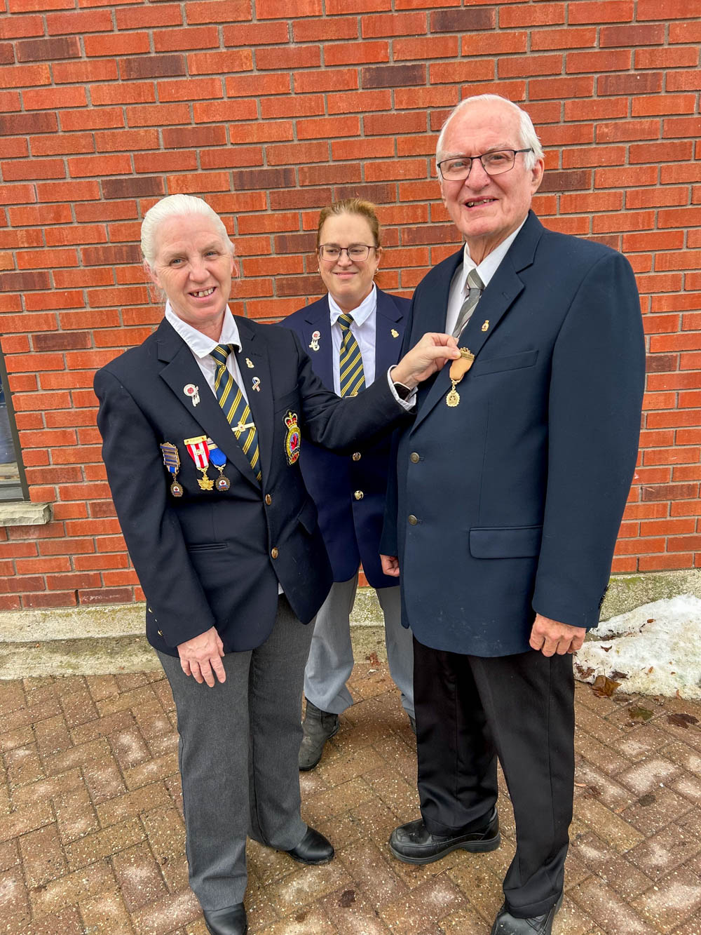 The first group honoured were branch members receiving their past president’s medal or bar. These included: Comrade Leslie Burnett (first vice president’s and Executive Committee bar), Comrade Lois Keller (Third Vice President’s bar), Comrade Kari Bourque (Poppy bar), Comrade Ted Bemister (second Vice President’s bar), Comrade Ruth Eadie (Past President’s and Honours and Awards bar), Comrade Doug Clarke (Lapel decoration), Comrade Roy Eaton (Constitution and Laws bar) and Comrade Christie Deschamps (Secretary bar and Honours of Awards bar).