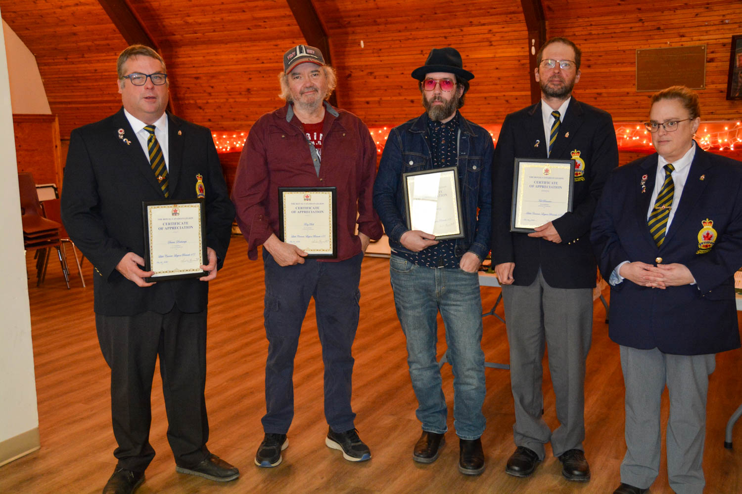 Certificates of Merit were presented to John Roy for donating time to DJ dances to raise money for the pool table refurbishing initiative; the Little Current Lions Club for their longtime support of the Legion and for sharing the Catch the Ace funds and, recently, making a large donation towards the new handicap accessible ramp; UCCM Castle Building Supply for donating new flooring for both the meeting room and the pool room; Comrade Jim Corrigan for his help in the Mindemoya area with the Poppy Campaign and for his work on the District Cenotaph Committee.