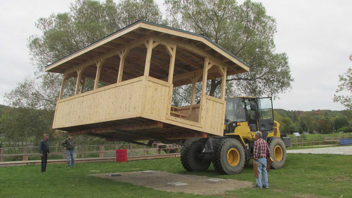 Cement pads to put under the gazebo were provided by Noble Lumber and Ron Campbell provided the loader to transfer the finished product from Evansville to its new site near the town splash pad. Brad Wright of Tenth Line Timber is donating steps for the front and back of the gazebo for people to enter.