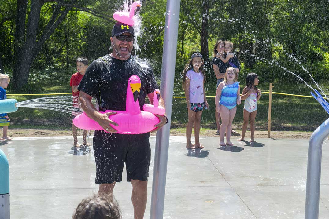 Mr. Mantha disappeared shortly after the waterworks began but soon made his way back inside the splash pad area sporting a pink flamingo around his waist and another small one atop his hat. He got into position and tested the bucket dumper to much laughter from the children.