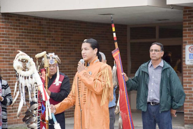 MSS student Pierre Debassige, Ogimaa Debassige’s son spoke on his dismay on the way Anishinabe culture, traditions and history are taught in the school system and his own disappointment that more of his fellow students were not outside attending the rally with him.