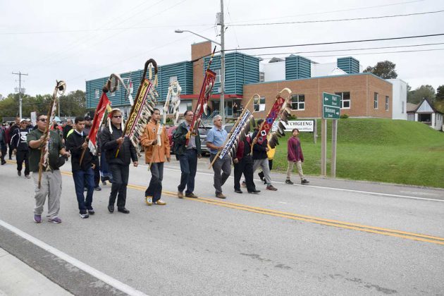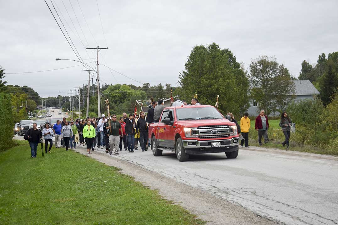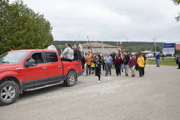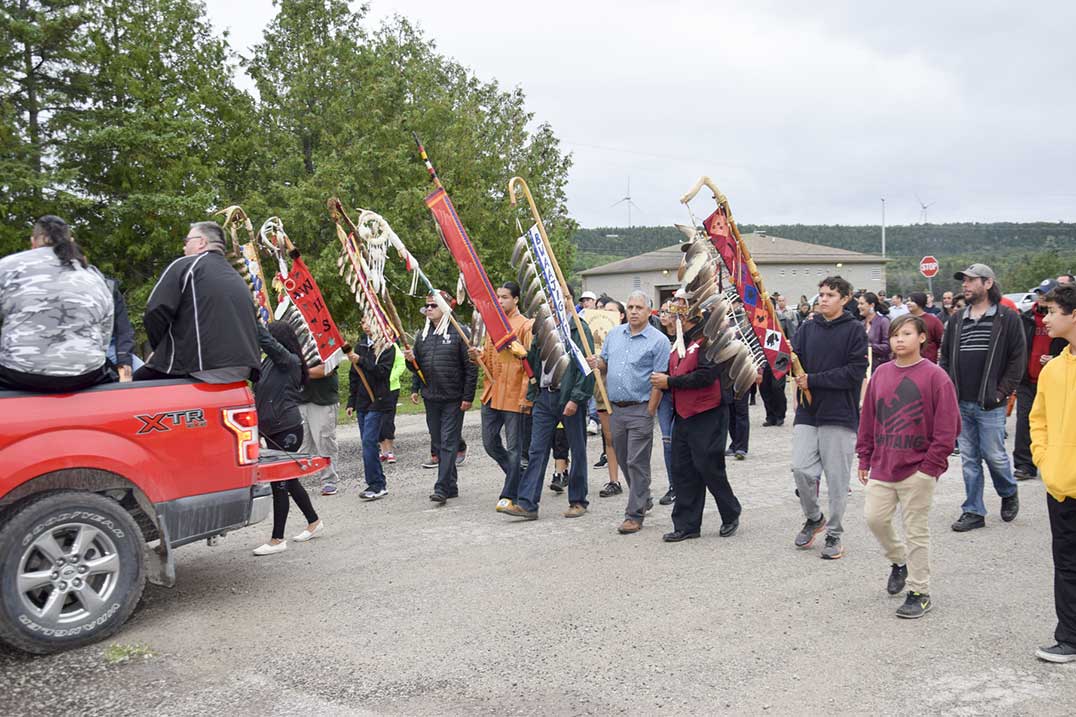 M’CHIGEENG—Eagle staffs from communities across Manitoulin Island gathered in front of the M’Chigeeng band office in a show of support for a rally organized by the M’Chigeeng First Nation that focused on the recent acts of violence that erupted at Manitoulin Secondary School (MSS) involving Indigenous and non-Indigenous students. Following a brief prayer by Sheguiandah elder Gordon Waindubence, the assembly processed to the high school led by a truck bearing the M’Chigeeng community drum, with chiefs and staff carriers following just behind.