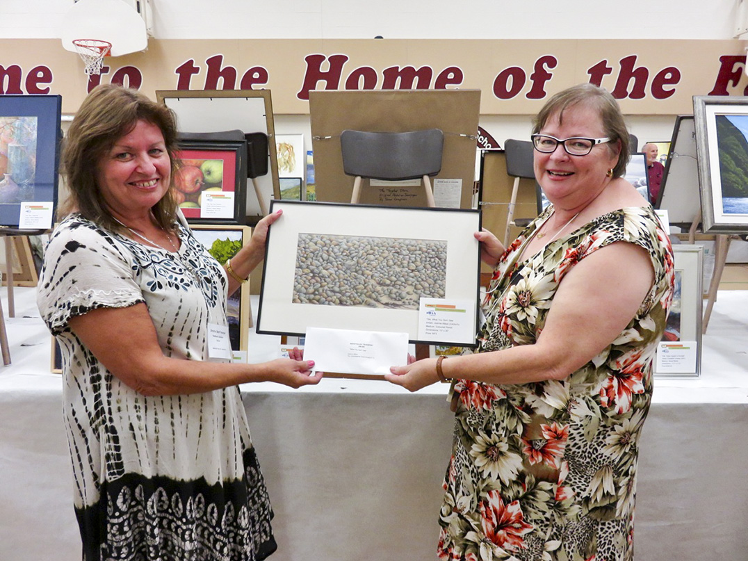 Photo caption: At the opening of the 59th Northern Ontario Art Association’s Juried Exhibition held September 19th in Corbeil, the Manitoulin Transport Award was presented to Joanne Abott from the Consolidated Artists Group of Seven (North Bay) for her piece entitled What You Don’t See. Here show convenor Elizabeth Delarosobel is receiving the award for Joanne from Christie Best Pearson, representing Manitoulin Transport.