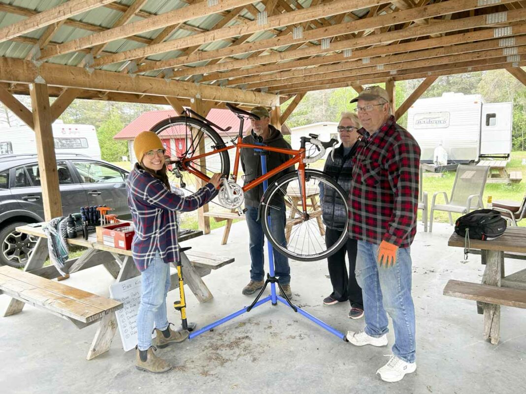 Rebeca Laurenti, left, hosted a series of successful bike kitchens on behalf of Manitoulin Island Cycling Advocates (MICA) recently where she taught people elements of bike mechanics such as changing a tire or replacing a chain. She’s seen with, from left, Guy Nielen, of MICA, Lee Baxter and John Finlay. This event took place Sunday afternoon in M’Chigeeng following a Saturday clinic in Gore Bay. Next Sunday, June 18 there will be a similar event in Mindemoya at 6152 Highway 542 from 2-4 pm (Maja’s Garden).