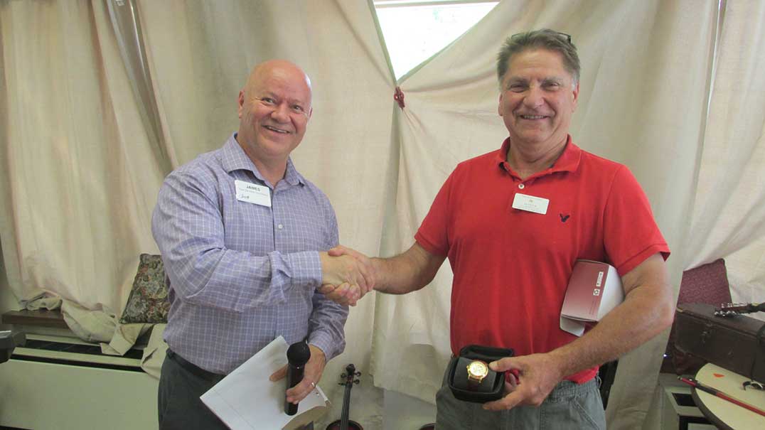 James Abraham, care services coordinator for Jarlette Health Services Inc., presented the beautiful Dragon Award watch to Mr. Atkins at the Lodge last week. “The Chinese dragon is associated with strength, health, harmony and good leadership. They have an active mind and share an interest in the world around them. They are self confident enough to know how to create a necessary impression.”