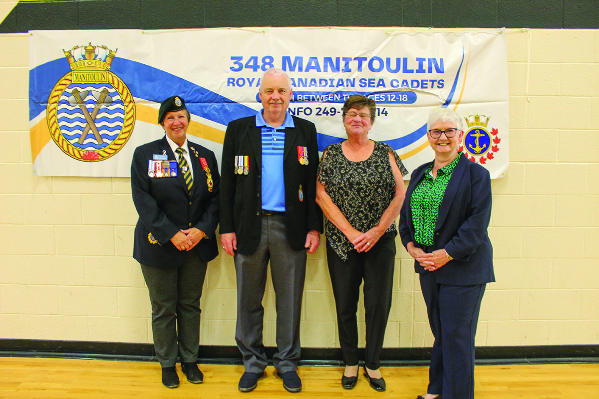 “We are very honoured to have Carmen Laidley, 348 Manitoulin Sea Cadets very first commanding officer, here as today’s reviewing officer,” said Mr. Blake. He noted the reviewing party was comprised of Reviewing Officer Carmen Laidley, the current Commanding Officer of RCSCC 348 Manitoulin, Lieutenant (Navy) Sylvain Boucher, Lieutenant Commander Nadine Leblond, of the North Bay detachment, and Manitoulin Navy League Branch President Bob Jewell.”