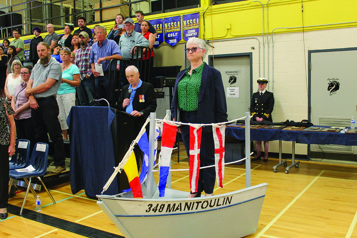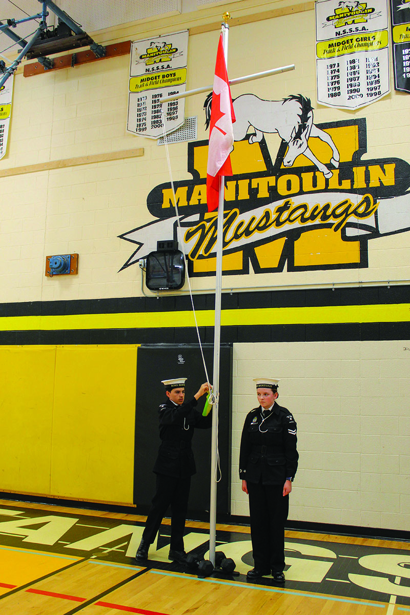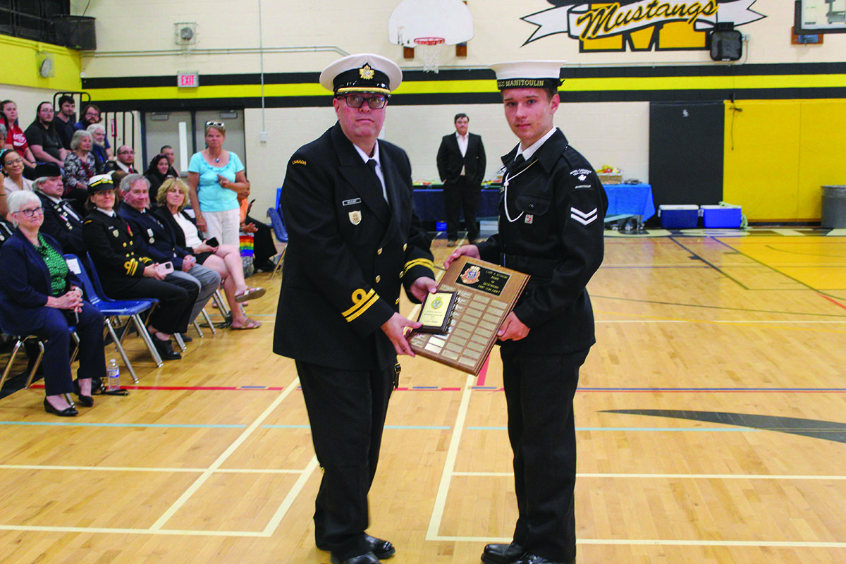 “The Corps began as a division of #134 Admiral Mountbatten Sea Cadet Corps at Sudbury, in the year 2000,” said Denis Blake, currently a civilian instructor, previously a commanding officer for the Corps, who was master of ceremonies for the special ceremony. “The founding members Ed Kift and Jeff Marshall, two Canadian Navy Veterans from Little Current, drive a small group of cadets to Sudbury for parade nights weekly for their training. This required dedication from everyone involved due to the four hours of driving on school nights. Assistance was also received from members of the Manitoulin and North Shore Navy Veterans Association.”