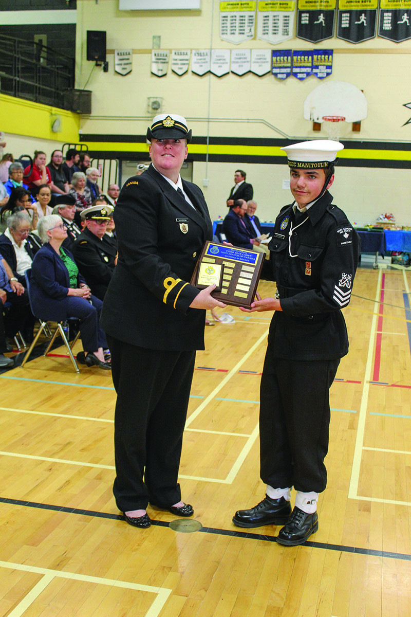 The Outstanding Top Cadet award was presented by Reviewing Officer Carmen Laidley to Chief Petty Officer 1st class Savannah Crack. This award is presented to the cadet who best exemplifies the cadet movement, excelled in drill, dress, deportment, and leadership skills and is acknowledged as the outstanding sea cadet in the Manitoulin Corps.