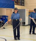 “On Saturday, the cadets participate in eight learning stations,” said Lt. Boucher. They included basic ropework of seven different knots with varying applications on a marine vessel, and how to rig tackles (pulley systems) using both “luff” and “two-fold purchase” set-ups; Heaving line, the technique of throwing a long line with a target stationed 35 feet away. This is used to pass lines from your vessel to the short, another vessel, or personnel in the water; boatman’s call, identifying pipes (tunes) and executing notes on a small, handheld whistle, traditionally used to deliver commands over the sound of the water, crew and other noises onboard a ship; monkey’s fist key chain. At this fun station, the cadets made personal key chains, creating a ‘monkey’s fist,’ a woven ball traditionally placed at the end of a heaving line to add weight; gyn-a gyn setup is a tripod of three large spars (poles) that are lashed together and raised using pulleys. This tripod is used for raising and lowering supplies between upper and lower decks on a ship; Scop 2, Radio communications, including procedures, checks, safety, urgency, and distress calls; Naval communications, using the phonetic alphabet, used for radio communication, and international signal flags, used traditionally to communicate between vessels or between a vessel and harbour; naval navigation, a game set up to teach on-the-water right of way, buoys, and emergency procedures.