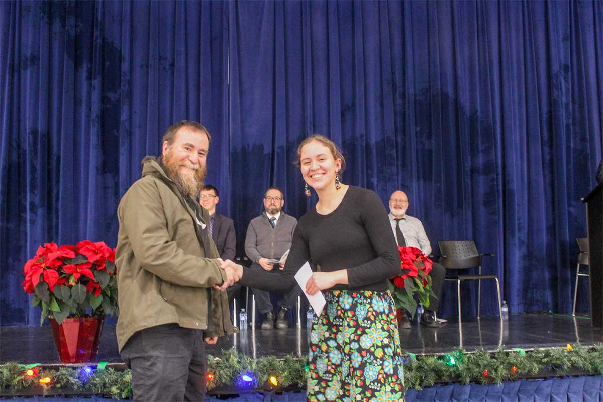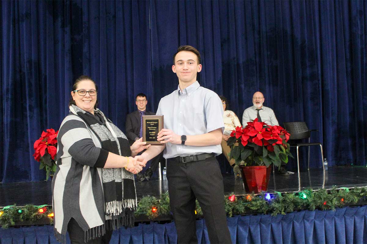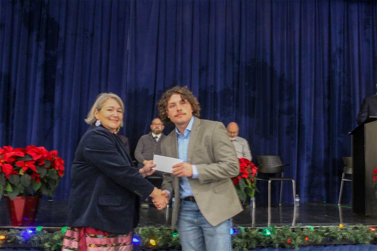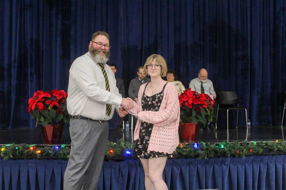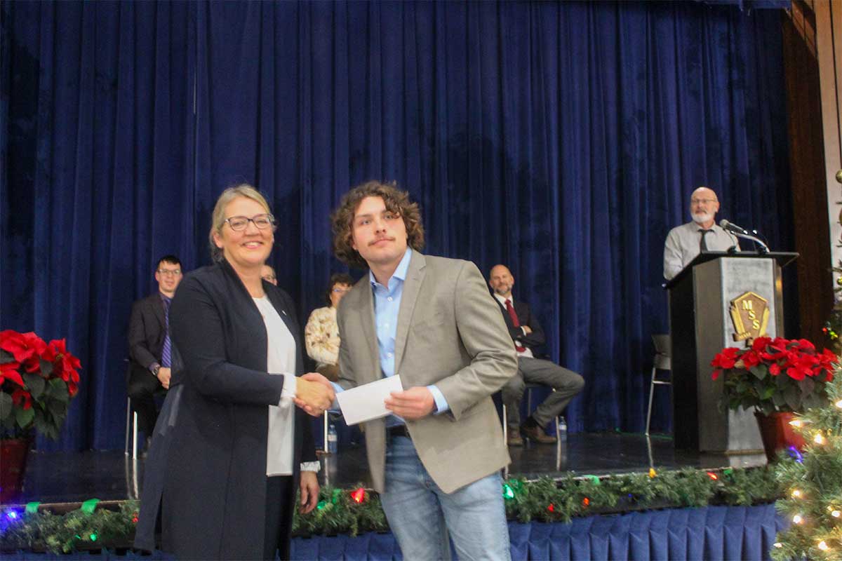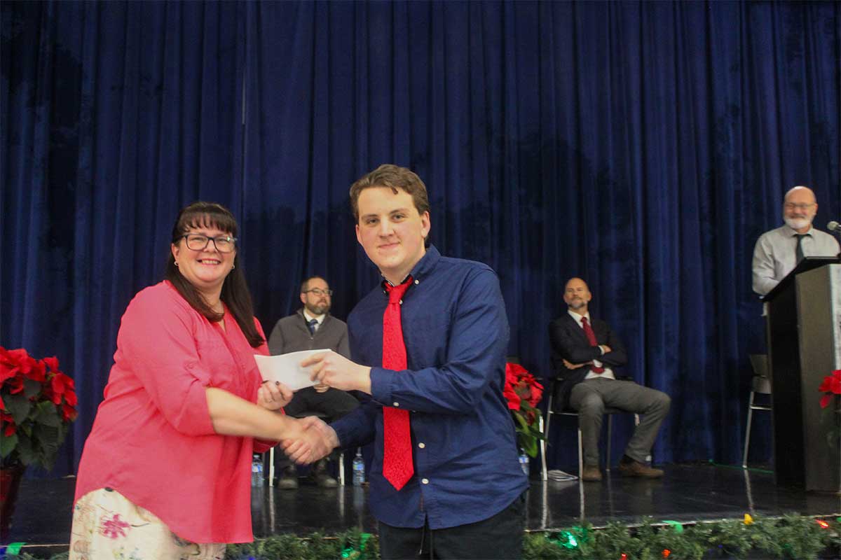 Awarded to an M.S.S. student continuing post-secondary education, who has exhibited courage in the face of adversity, overcoming personal hardship and for academic improvement. Presented by Mrs. Dawn Roque to Ezra Diebolt.