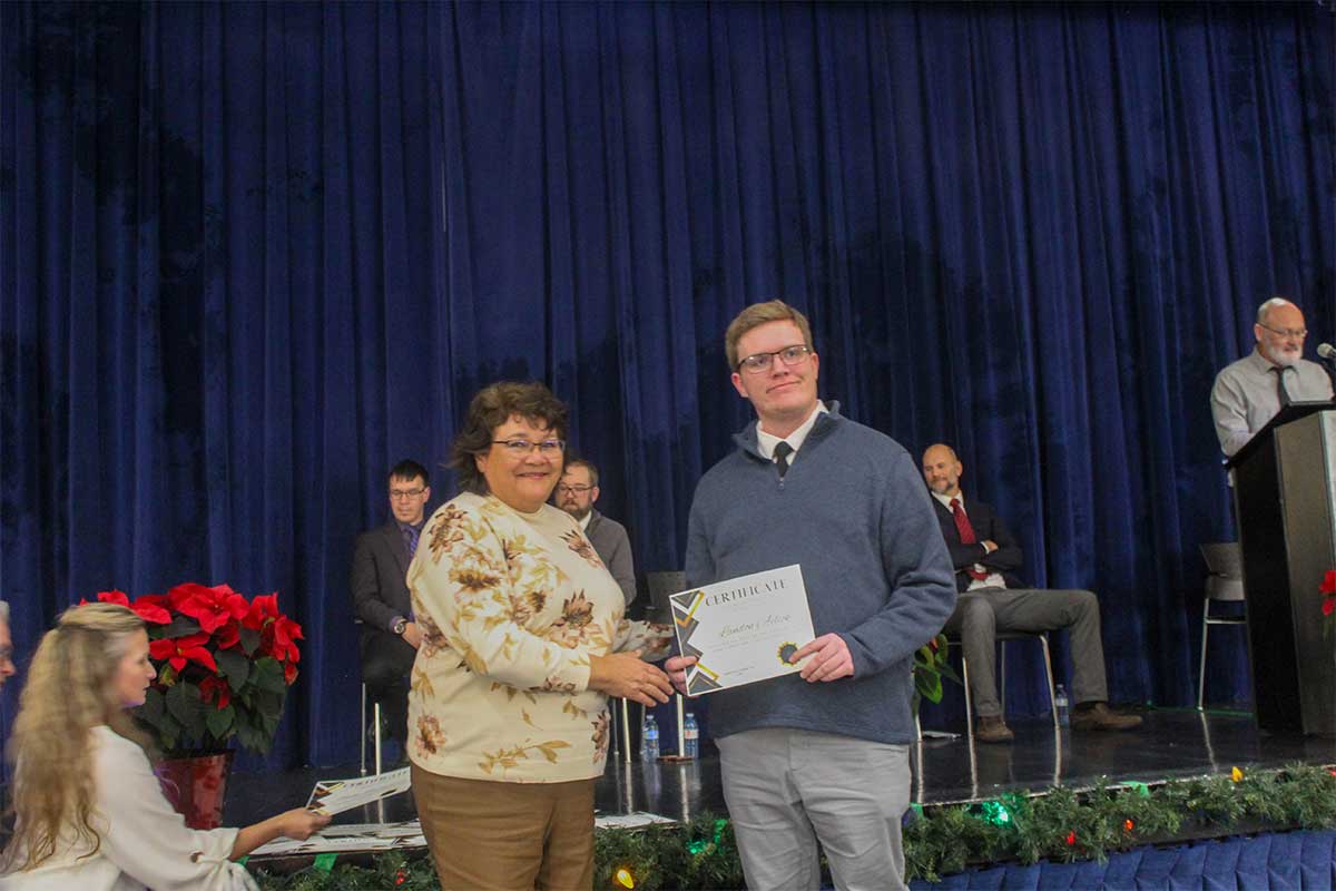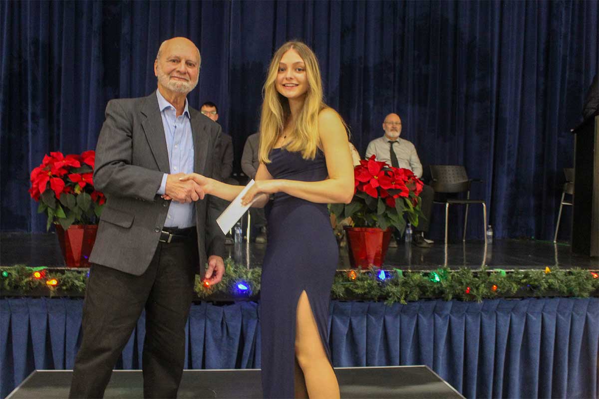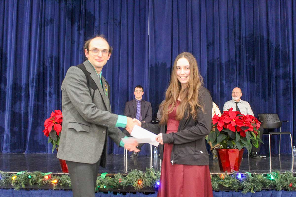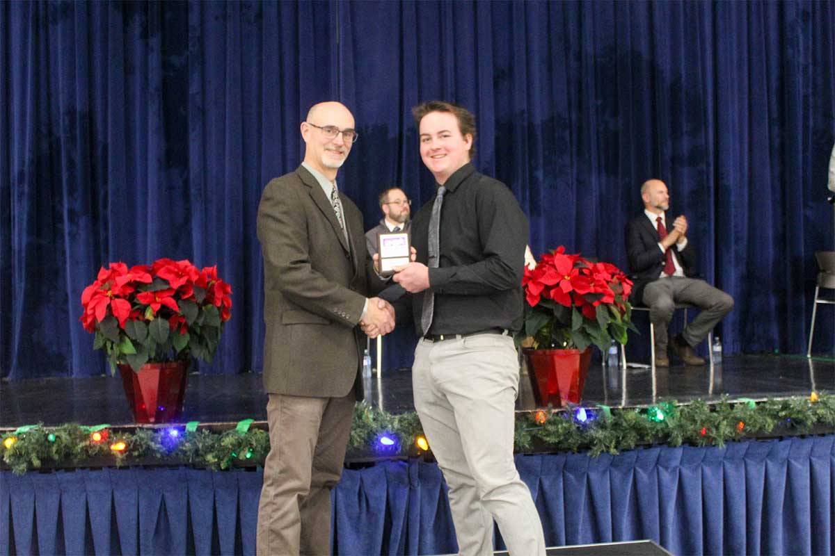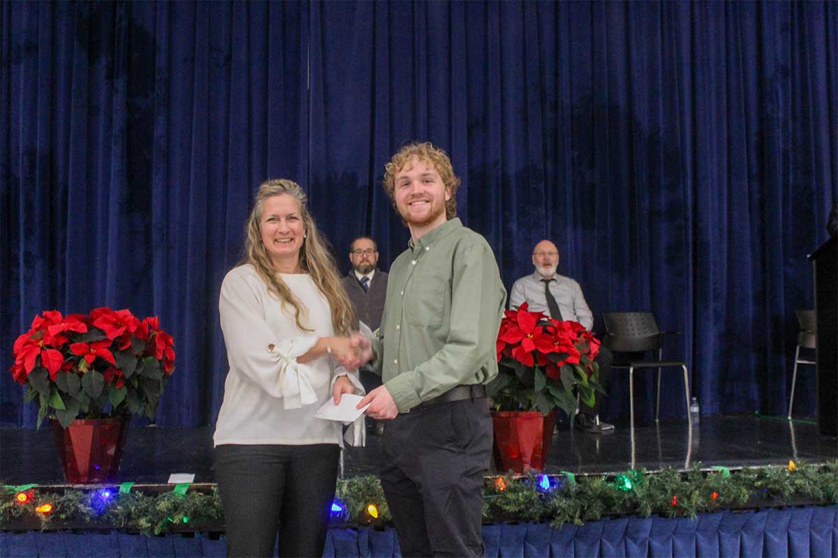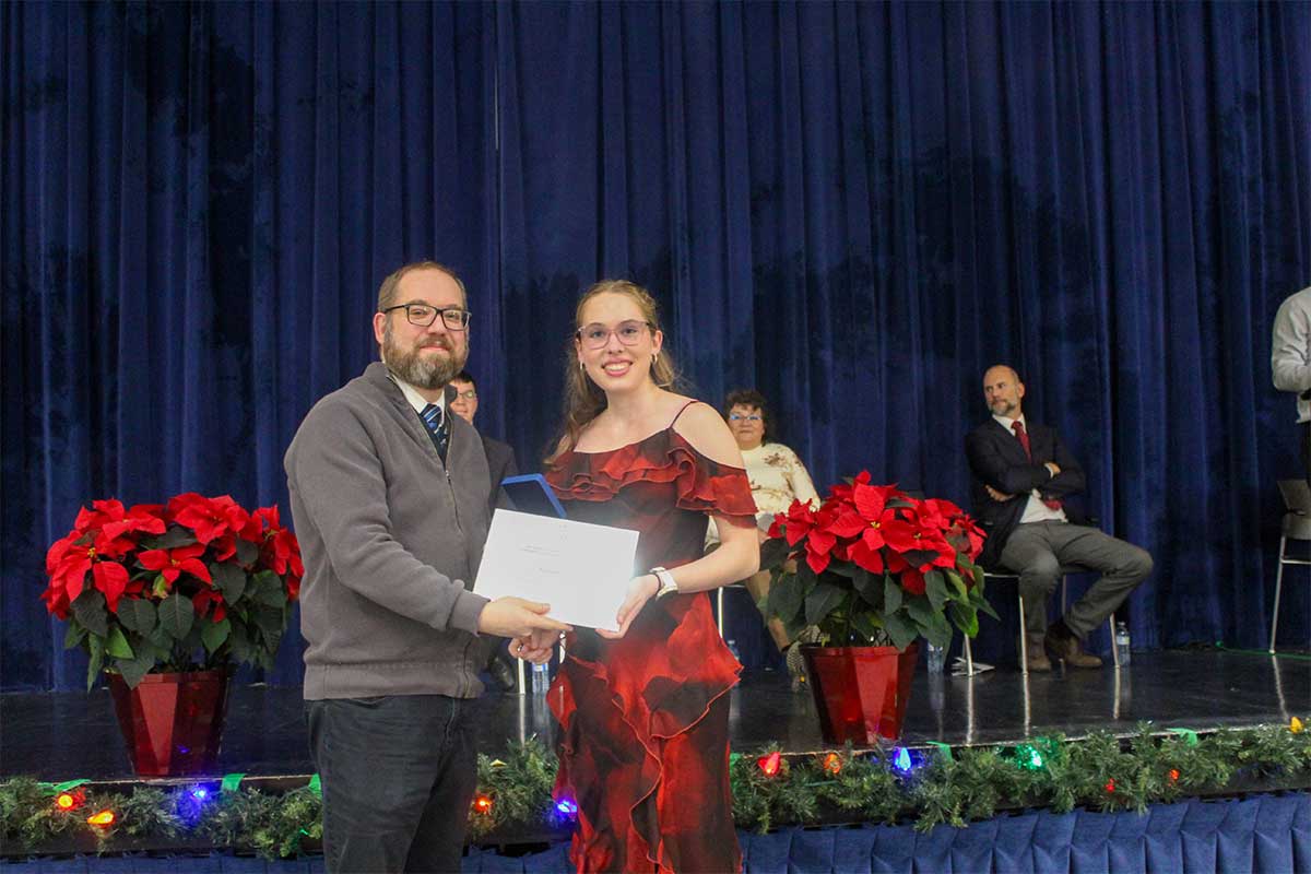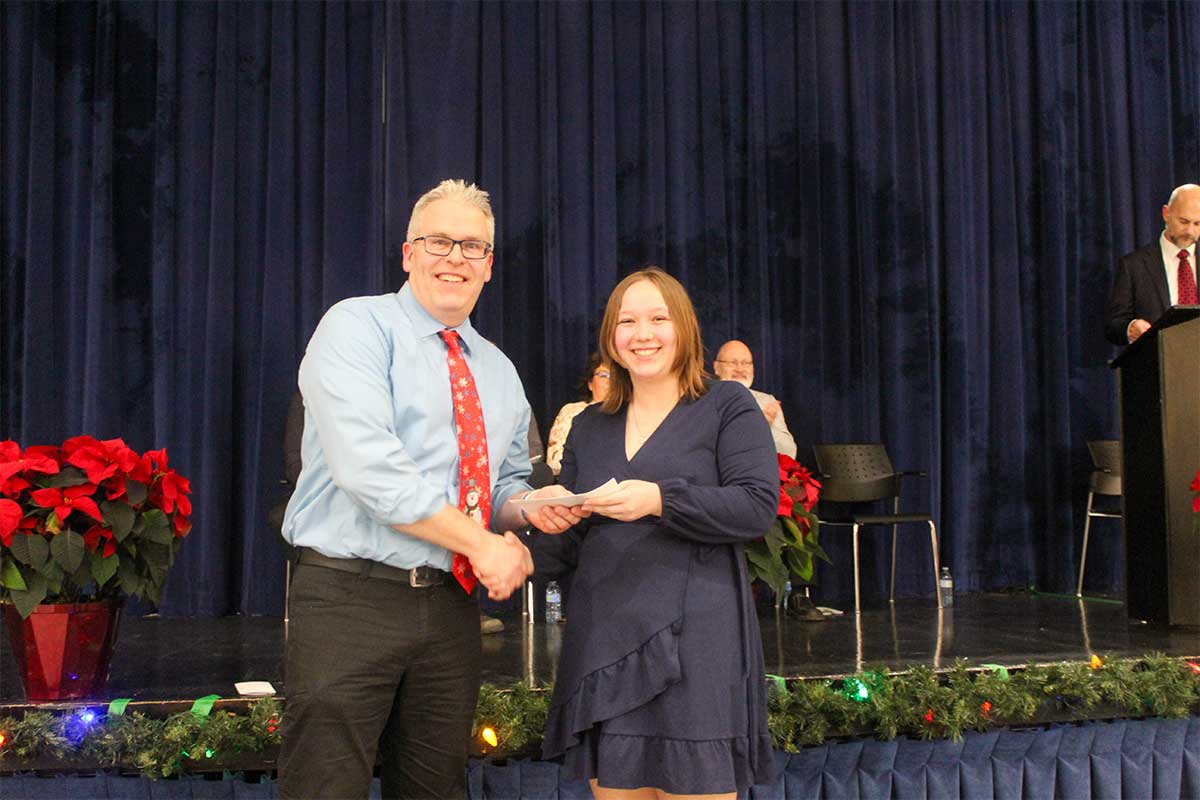 Awarded to an M.S.S. student continuing post-secondary education, who has exhibited courage in the face of adversity, overcoming personal hardship and for academic improvement. Presented by Mrs. Dawn Roque to Ezra Diebolt.