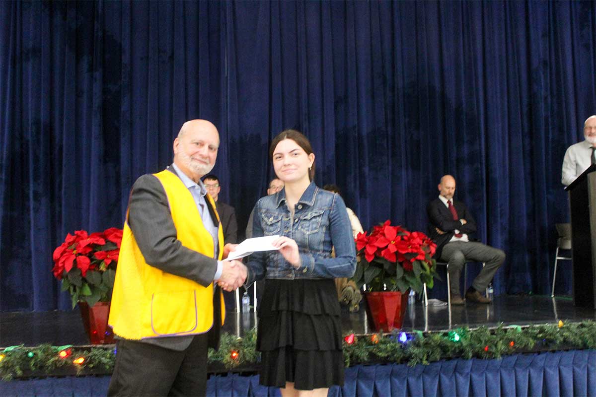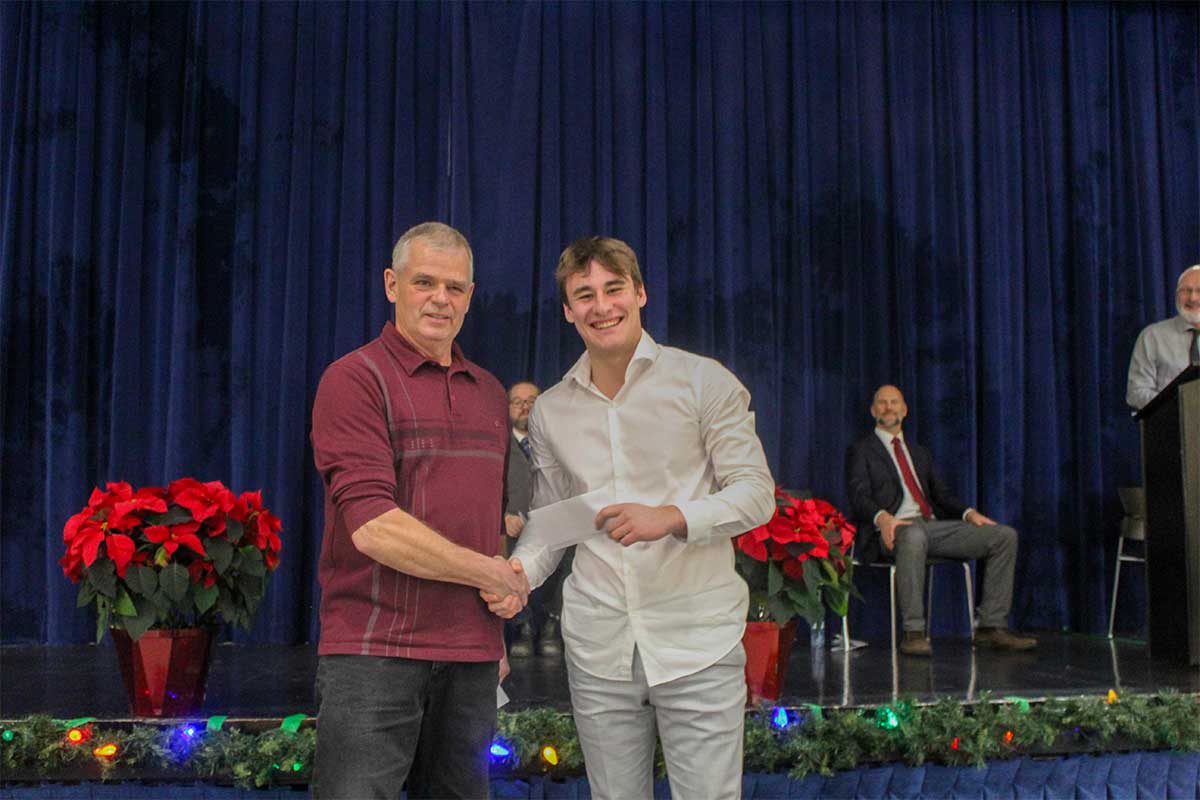 Donated by Stan & Beth Ferguson in fond memory of Wes Parkinson to a graduate continuing post-secondary education. Presented by Ms. Erin Ferguson to Caleb Tasse.