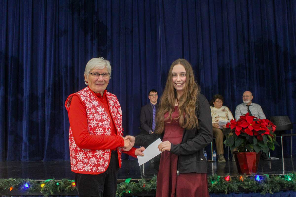 Donated by Mark & Bonnie Young in memory Marjorie Young to a deserving graduate continuing their post-secondary education in a medical related field. Presented by Ms. Mel Cheng to Ava Fields.