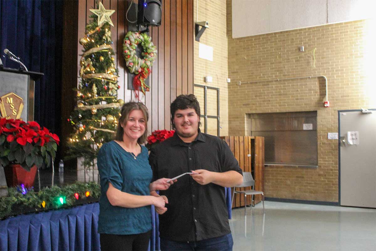 Awarded in memory of former M.S.S. English teacher Tom Porter to a graduate continuing post secondary education. Presented by Ms. Maya Holson to Ryan Kuntsi.