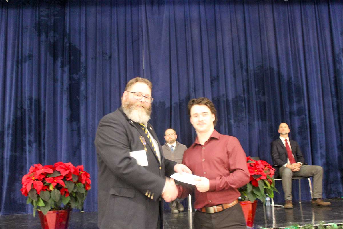 To two Western Manitoulin graduates, continuing post-secondary education, who are the child or grandchild of Branch #514 members. Presented by 1st Vice President Trevor Wright to Corbin Best and Patrick McCann.