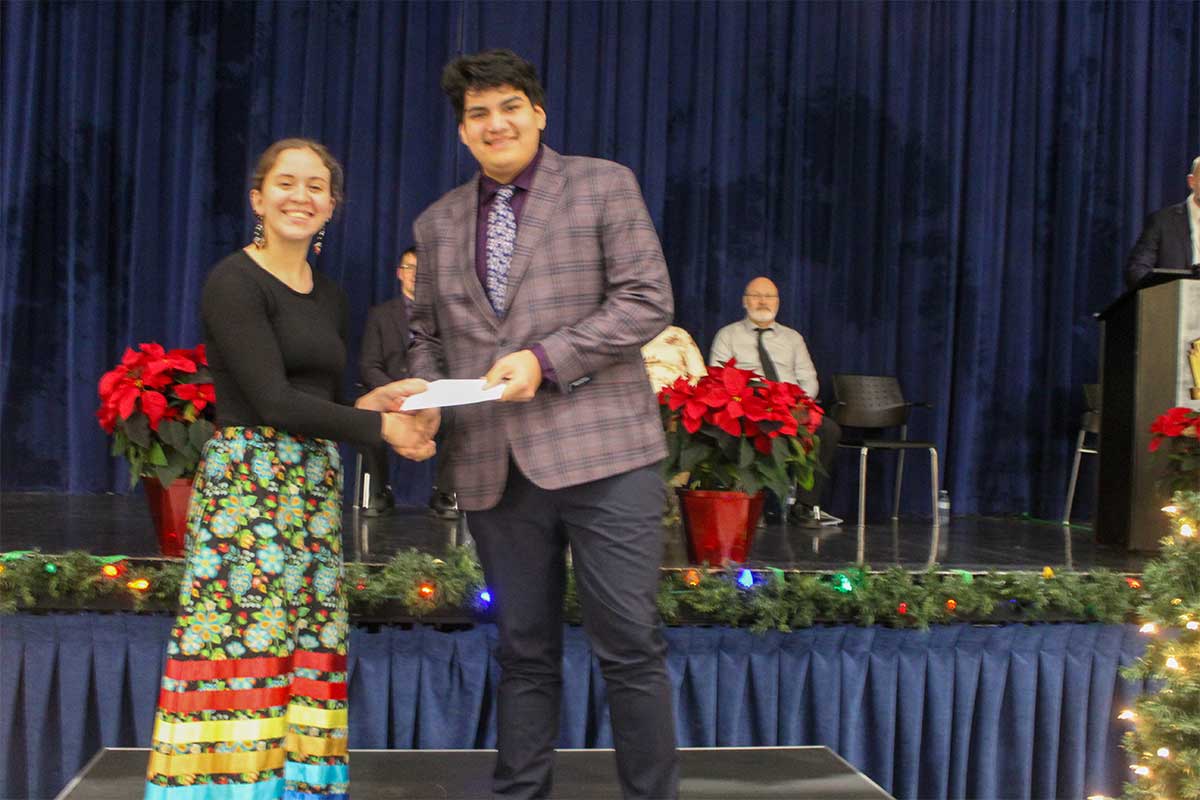 Presented to a deserving graduate continuing post-secondary education. Presented by Ms. Darci Debassige to Jaron Panamick.
